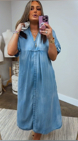 You're going to want this dress in your closet ASAP! Features a lightweight denim material, functional buttons, side slits, has pockets, pleated detailing, collar detailing & v-neckline. Style her with your favorite wedges & jewels for the cutest fit!